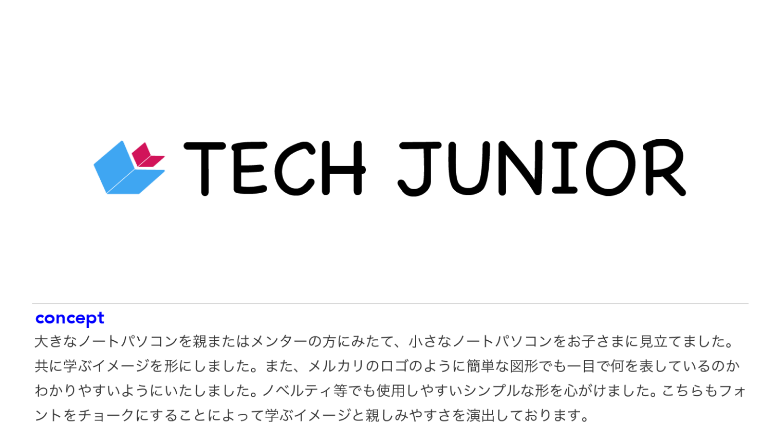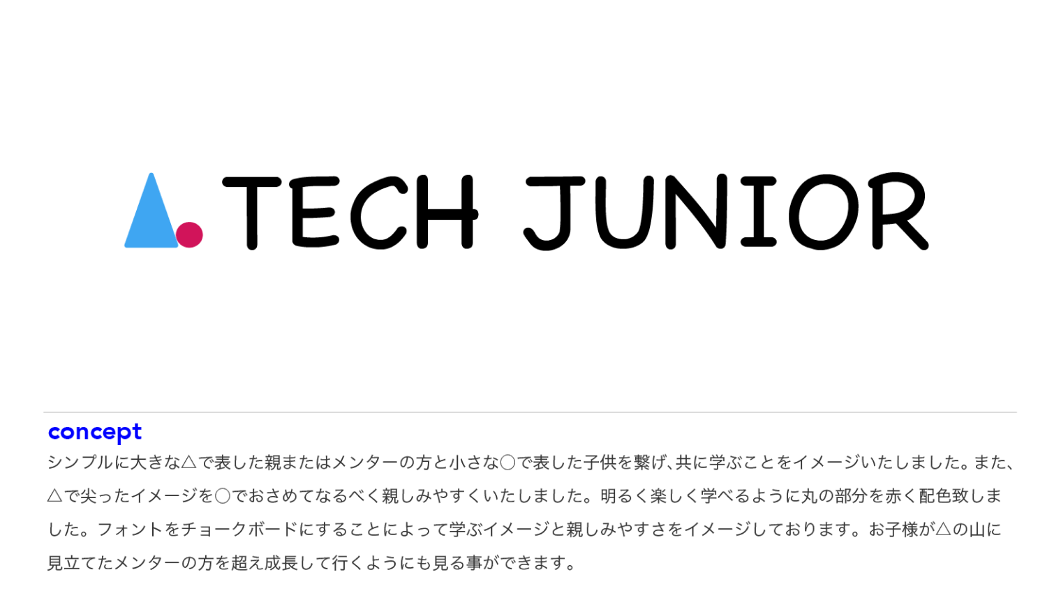 TECH CAMPでの、模擬案件。架空のプログラミングスクール新規立ち上げのための、ロゴマーク製作を依頼されました。見ただけで、対象年齢がいくつなのか、どのようなサービスなのか連想できるよう、工夫をいたしました。