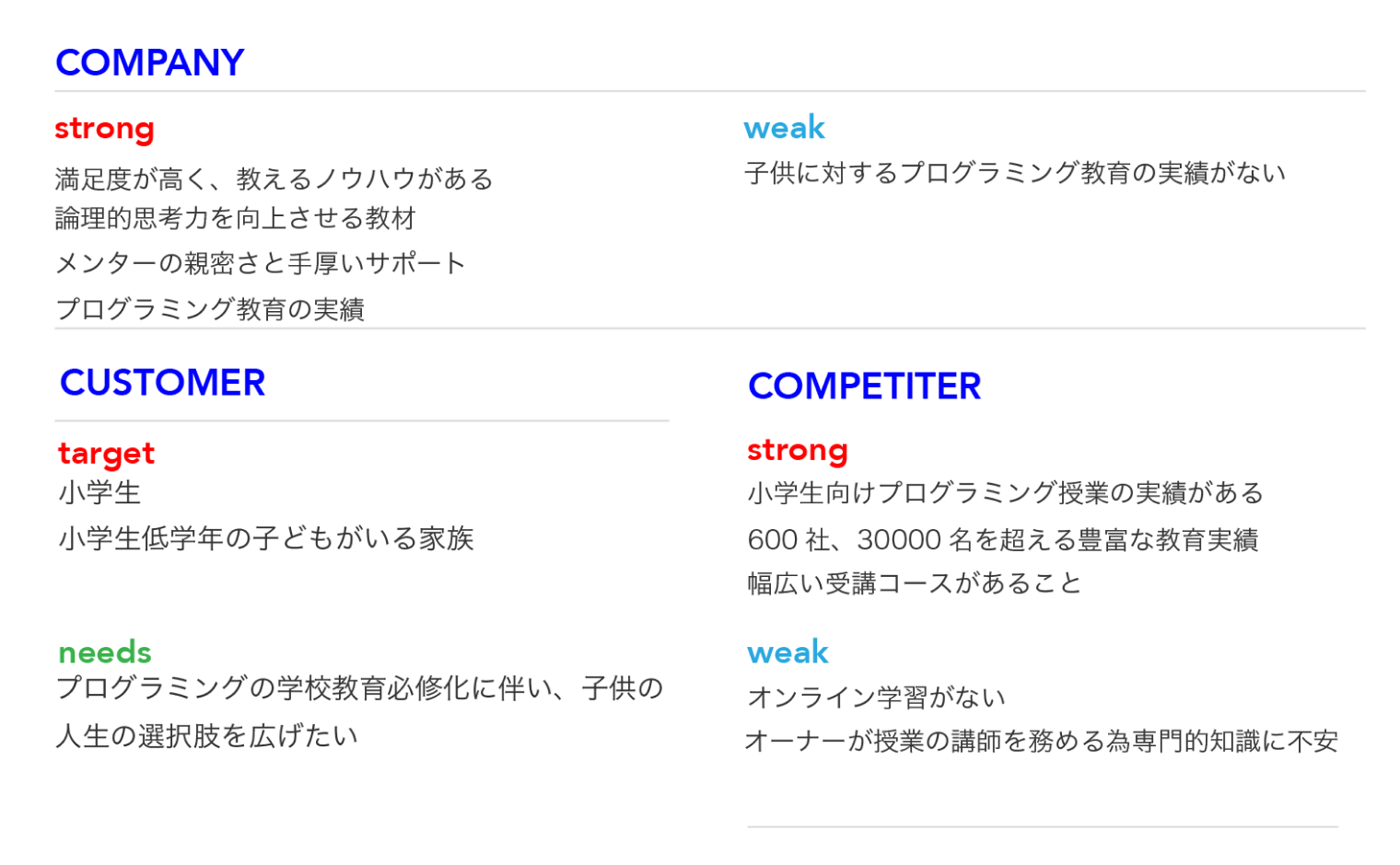 3C分析を行ったところ、メンターの教育レベル、サポート力からくる満足度の高さが強みとして挙げられました。一方で、ポジションの近い競合他社では、メンターをオーナー制で採用している場合があるため、専門的知識が不安であり、満足度が低い場合もあると判明。ターゲットも判明した事で、デザインに落とし込むための要素を確認する事ができました。