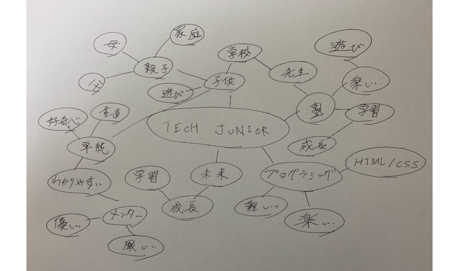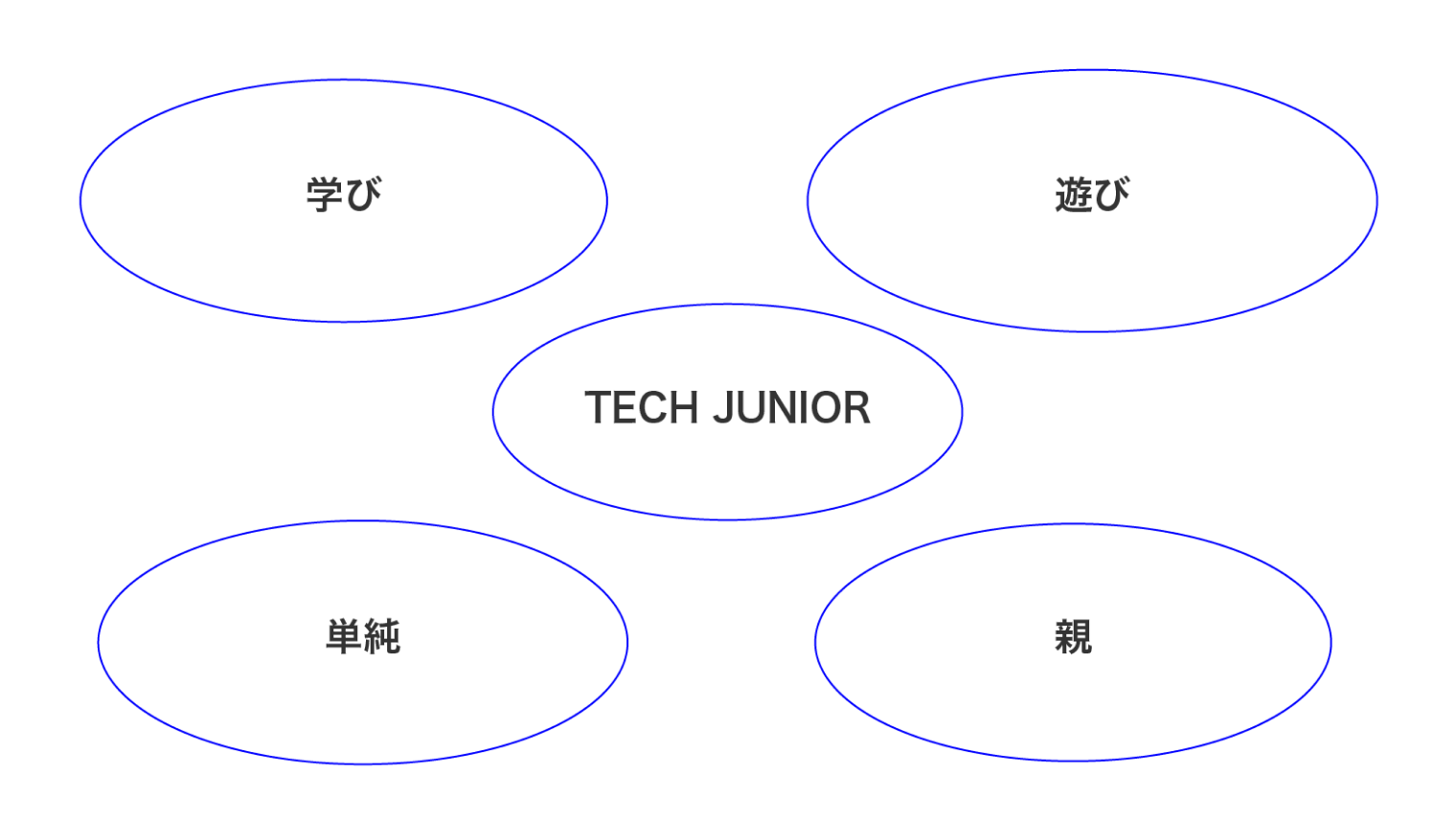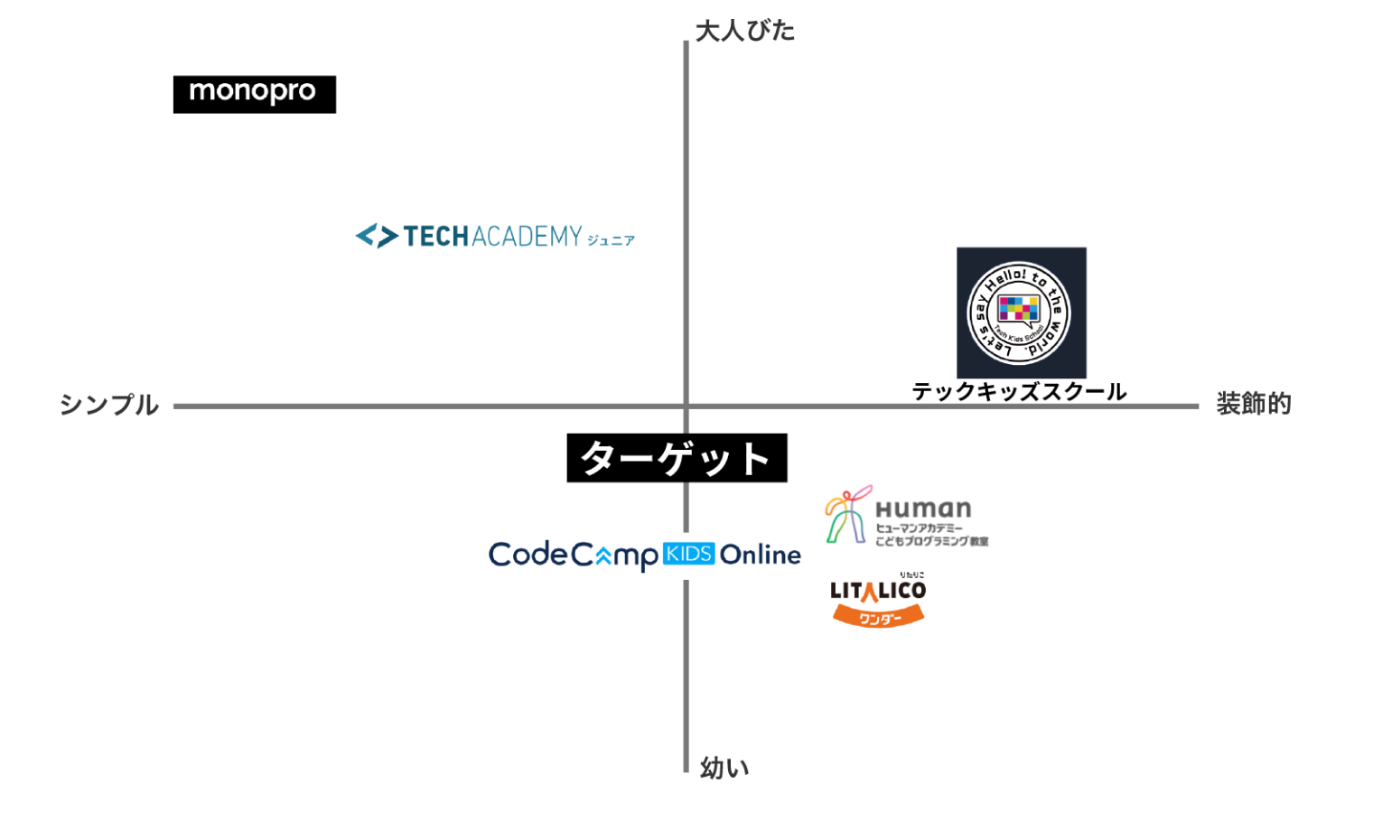 テックジュニアのポジショニングマップを作ってみた際、二軸にロゴ自体が『幼いか大人びているか』『シンプルか装飾的か』に設定したところ、ちょうど真ん中に置くことができました。